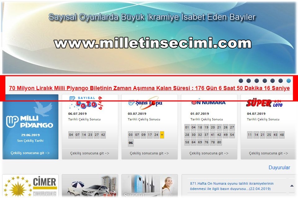 Milli Piyango İdaresi’nin 2019 yılı yılbaşı özel çekilişinde, 70 milyon liralık büyük ikramiyeyi kazanan talihli, hala ortaya çıkmadı. Milli Piyango İdaresi Genel Müdürlüğü’nce internet sitesine konulan ‘sayaç’ akmaya devam ediyor. Sayaç sıfırlandığı zaman talihli ikramiyeyi alma hakkını kaybedecek. Sayaca göre, bugün itibarıyla 70 milyon liralık büyük ikramiyenin isabet ettiği bilet, 176 gün sonra zaman aşımına uğrayacak.