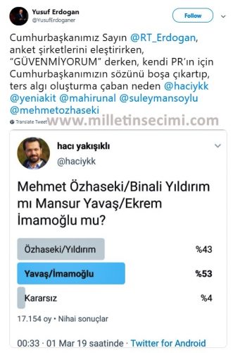 Bu anketlerin benzerleri her ne kadar bilimsel olmasa da sosyal medyada da gerçekleştiriliyor. Anketi yapan isimlerden biri de Akit gazetesinin Ankara Temsilcisi Hacı Yakışıklı oldu. Yakışıklı takipçilerine “Mehmet Özhaseki/Binali Yıldırım mı Mansur Yavaş/Ekrem İmamoğlu mu?” diye sordu.