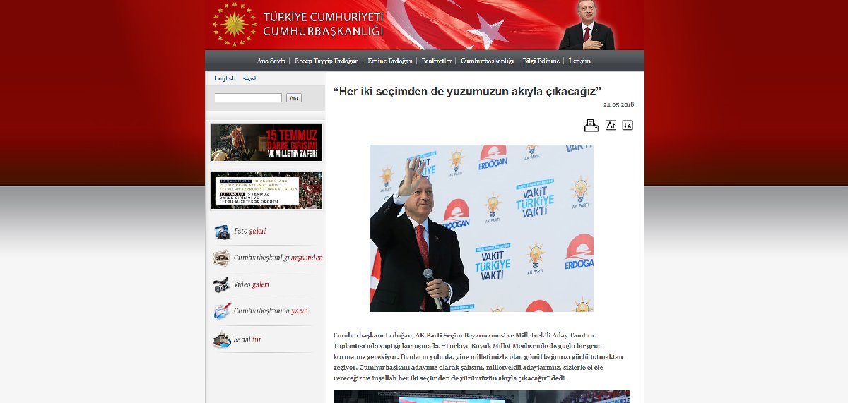 Cumhurbaşkanlığı’nın resmi internet sitesinde, AKP’nin dün yaptığı aday tanıtım toplantısına yer verildi, AKP’li vekil adayları ile Cumhurbaşkanı Erdoğan’ın “AKP Genel Başkanı” sıfatıyla çektirdiği tüm fotoğraflar yayına koyuldu. CHP İstanbul Milletvekili Gürsel Tekin bu uygulamaya tepki göstererek, “Anayasa gereği tarafsız olması gereken makamı, siyasi propaganda meydanı haline getirdiniz” dedi. Tekin, Cumhurbaşkanlığı’nın resmi internet sitesinde AKP propagandası yapılmasına en çok AKP’nin seçimlere birlikte gireceği MHP’nin tepkisini merak ettiğini de söyledi.