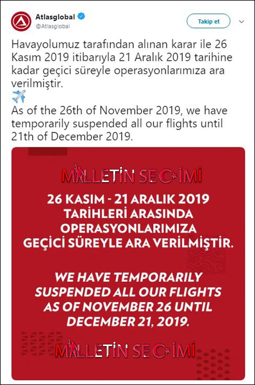 AtlasGlobal, bugün yaptığı açıklama ile 26 Kasım saat 19.30 itibari ile uçuşlarına ara verme kararı aldı.
