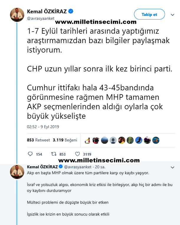 “AK Parti en başta MHP olmak üzere tüm partilere karşı oy kaybı yaşıyor. İsraf ve yolsuzluk algısı, ekonomik kriz etkisi ile birleşiyor, AK Parti hiç bir adımı ile bu oy kaybını durduramıyor. Mülteci problemi de düşüşte büyük etken. İşsizlik ise krizin en büyük sonucu olarak etkili.İstanbul seçimlerinde yaşananlar ve haksızlık yapıldığı algısı da çok büyük kırılma meydana getirmiş.