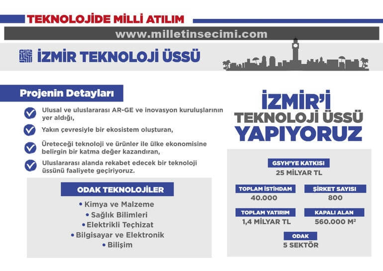 “İzmir’e teknoloji üssü inşa ediyoruz. Elektronik, kimya ve bilişim odaklı projelerimizle Ege Bölgesi ve Türkiye küresel ölçekte rekabetçi olacak. Vakit bilişim vakti. Vakit Türkiye vakti.” ifadesini kullanan Erdoğan, projeye ilişkin detayların yer aldığı görseli de paylaştı.