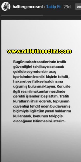 Konu ile ilgili resmi makamlar nezdinde gerekli işlemleri başlattım. Trafik kurallarını ihlal ederek, toplumun güvenliğini tehdit eden bu davranış biçimiyle ilgili tüm yasal haklarımı kullanarak, konunun takipçisi olacağımın bilinmesini isterim” dedi.