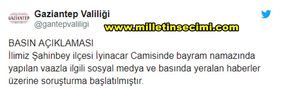 Görüntülerin sosyal medyada yayılması ve tepki çekmesinin ardından Gaziantep Valiliği olayla ilgili yaptığı açıklamada imamla ilgili soruşturma başlatıldığını duyurdu. Valilikten yapılan açıklamada “İlimiz Şahinbey ilçesi İyinacar Camisinde bayram namazında yapılan vaazla ilgili sosyal medya ve basında yeralan haberler üzerine soruşturma başlatılmıştır” ifadeleri kullanıldı.