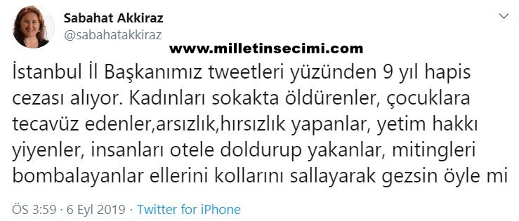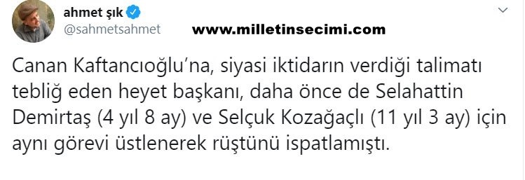 2012-2017 tarihleri arasında sosyal medya hesabı üzerinden yaptığı paylaşımları nedeniyle hakkında “Cumhurbaşkanına hakaret”, “Kamu görevlisine görevinden dolayı hakaret”, “Türkiye Cumhuriyeti Devletini alenen aşağılama”, “Halkı kin ve düşmanlığa alenen tahrik etmek” , “Terör örgütü propagandası yapmak” suçlarından dava açılan CHP İstanbul İl Başkanı Canan Kaftancıoğlu, 5 ayrı suçtan ertelemesiz 9 yıl 8 ay hapis cezasına çarptırıldı.