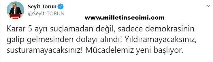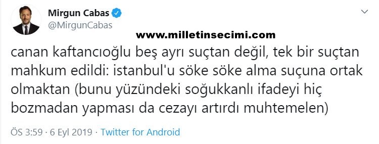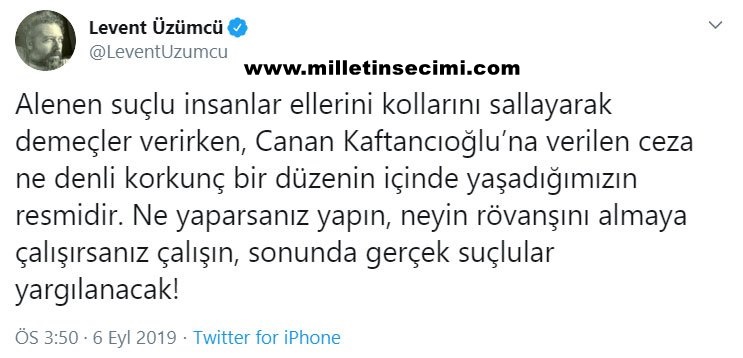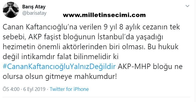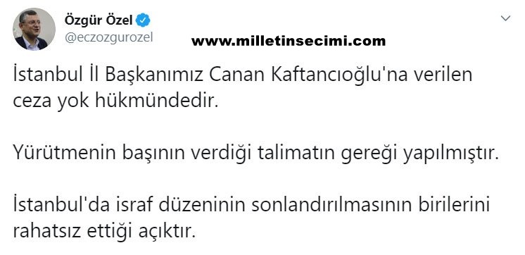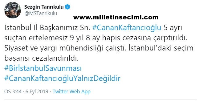 Kaftancıoğlu hakkında verilen karara ilk tepki duruşmaları da takip eden CHP İstanbul Milletvekili Sezgin Tanrıkulu’ndan geldi. Tanrıkulu, twitter hesabından yaptığı açıklamada “İstanbul İl Başkanımız Sn. #CananKaftancıoğlu 5 ayrı suçtan ertelemesiz 9 yıl 8 ay hapis cezasına çarptırıldı. Siyaset ve yargı mühendisliği çalıştı. İstanbul’daki seçim başarısı cezalandırıldı.” dedi.