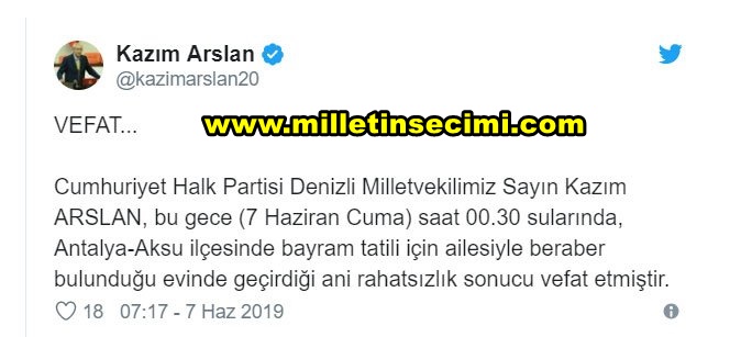 CHP yetkililerinden alınan bilgiye göre, Denizli Milletvekili Arslan, bu gece saat 00.30 sularında Antalya’nın Aksu ilçesinde bayram tatili için ailesiyle bulunduğu evde rahatsızlandı. Arslan, geçirdiği ani rahatsızlık sonucu vefat etti.