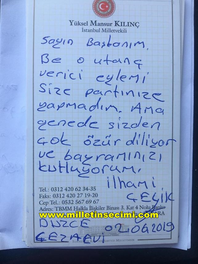 “2 Haziran 2019 Pazar günü yapılan ve yaklaşık 30 dakika süren görüşmede İlhami Çelik, hangi kışkırtmalardan etkilenerek eylemi gerçekleştirdiklerini tüm ayrıntılarıyla anlatmıştır. Pişman olduğunu belirten İlhami Çelik eylemi ATV ve A Haber’de Adalet Yürüyüşünü ve Genel başkanımız Kemal Kılıçdaroğlu’nu hedef alan kışkırtıcı haberlerden etkilenerek gerçekleştirdiğini, pişman olduğunu, özür dilediğini ifade etti.”