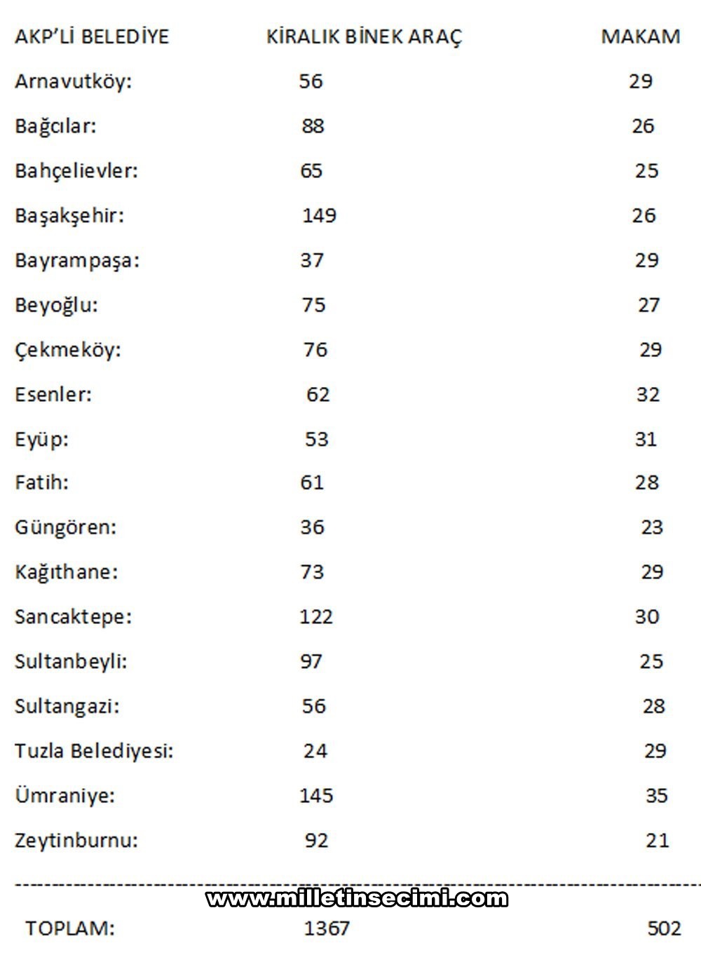 İstanbul’un AKP’li 18 ilçe belediyesinde kişilere tahsis edilerek kullanılan bin 367 adet kiralık binek aracı olduğu ortaya çıktı. 18 ilçedeki toplam yönetici sayısı sadece 502. En çok kiralık araç 149 ile Başakşehir’de bulunuyor.