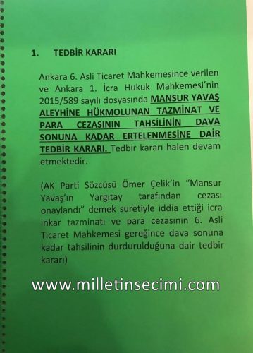 İktidara yakın bir gazete CHP’nin Ankara Büyükşehir Belediye Başkan adayı için “Sahte senetten tazminat cezası aldı” iddiasının yer aldığı bir habere yer vermiş, bu haberle ilgili konuşan AKP Sözcüsü Ömer Çelik ise “Açıklama bekledik gelmedi. Ne Mansur Yavaş ne CHP iddialara yanıt verdi. Biz inceledik ve vardığımız sonuçlar bu şekilde vahim bir tabloyu ortaya koyuyor. CHP’nin ve Mansur Yavaş’ın suskunluğunu da vatandaşımızın takdirine arz ediyoruz.” demişti.