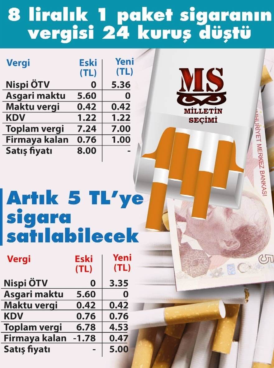 Dumansız hava sahasıyla sigara kullanımını azaltmayı hedefleyen iktidar 7 liranın altında satılmasını önlemek için paket başına getirdiği 5.6 liralık asgari maktu vergiyi sıfırladı. Firmalar isterse 3 liraya bile sigara satabilecek.