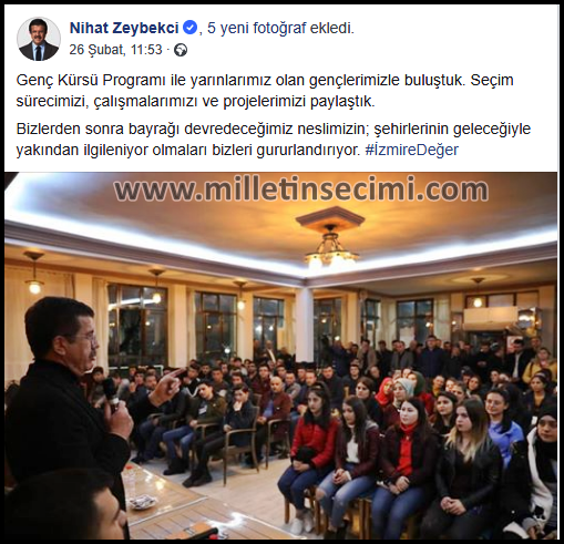 Zeybekci ise fotoğrafı paylaşırken, “Genç Kürsü Programı ile yarınlarımız olan gençlerimizle buluştuk. Seçim sürecimizi, çalışmalarımızı ve projelerimizi paylaştık. Bizlerden sonra bayrağı devredeceğimiz neslimizin; şehirlerinin geleceğiyle yakından ilgileniyor olmaları bizleri gururlandırıyor” ifadelerini paylaştı.