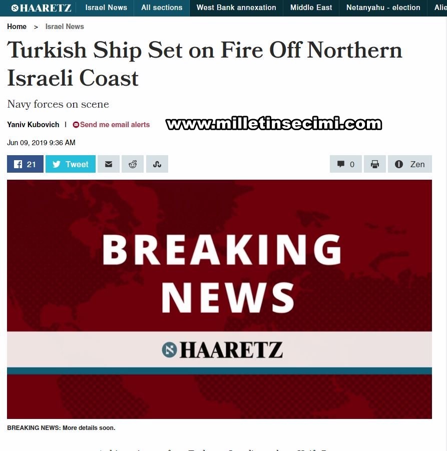 İsrail’in çok okunan İngilizce gazetelerinden Haaretz, Türkiye’den çıkan bir geminin İsrail’in kuzeyindeki Haifa açıklarında yandığını yazdı. İsrail donanmasının olay yerine gittiği ve duruma müdahale ettiği açıklandı.