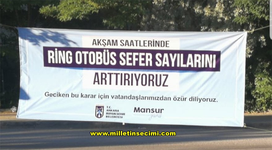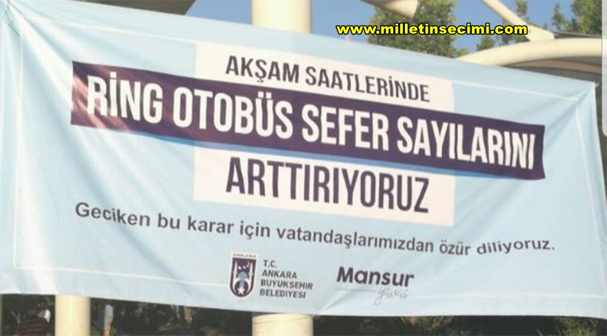 Ring otobüs duraklarında teftişe çıkan Ankara Büyükşehir Belediye Başkanı Mansur Yavaş, vatandaşların şikayetleri üzerine durakları “özür dileriz” pankartı ile donatıp ring otobüs sefer sayılarını akşam saatlerinde artırdıklarını duyurdu.