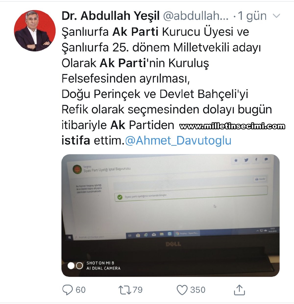 Abdullah Yeşil: Kurucu üyesi ve milletvekili adayı olarak AK Parti’nin kuruluş felsefesinden ayrılması, Doğu Perinçek ve Devlet Bahçeli’yi refik olarak seçmesinden dolayı bugün itibariyle istifa ettim.