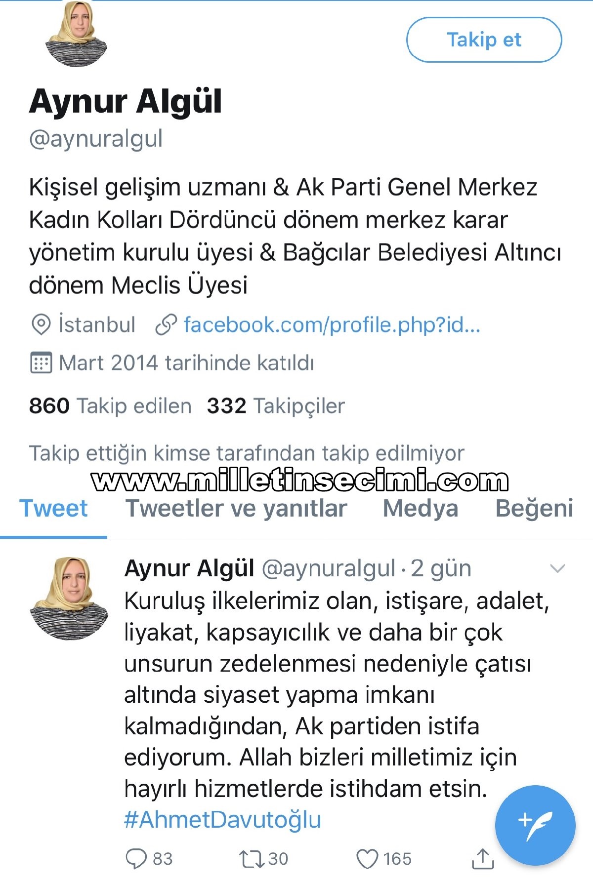 Aynur Algül: Kuruluş ilkelerimiz olan, istişare, adalet, liyakat, kapsayıcılık ve daha birçok unsurun zedelenmesi nedeniyle çatısı altında siyaset yapma imkanı kalmadığından AK Parti’den istifa ediyorum.