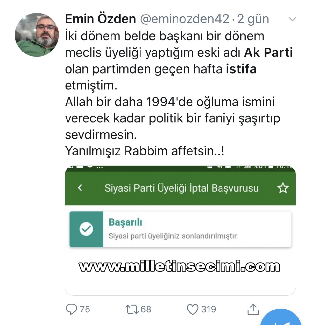 Emin Özden: İki dönem belde başkanı bir dönem meclis üyeliği yaptığım eski adı AK Parti olan partimden geçen hafta istifa etmiştim. Allah bir daha 1994’de oğluma ismini verecek kadar politik bir faniyi şaşırtıp sevdirmesin. Yanılmışız rabbim affetsin.